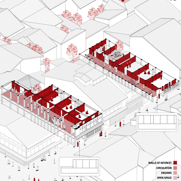 Through plan and section analysis, we identified four core spatial strategies: flexibility, linear procession, threshold, and engawa circulation. A series of design tests then reoriented the Machiya toward each of these properties, revealing how subtle shifts in spatial emphasis could transform the typology’s behavior and atmosphere.